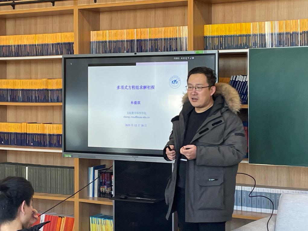 “对于数学未来发展,具有决定性影响的一个不可估量的方面是计算机对数学带来的冲击,在不久的将来,电子计算机之于数学家将与显微镜之于生物学家、望远镜之于天文学家那样不可或缺。”以吴文俊先生的观点为引,牟晨琪讲解了计算机工具对于数学研究中的推动作用,并以“多项式方程组求解初探”的讨为例,带同学们初步领略了“几何定理机器证明”的巧妙。