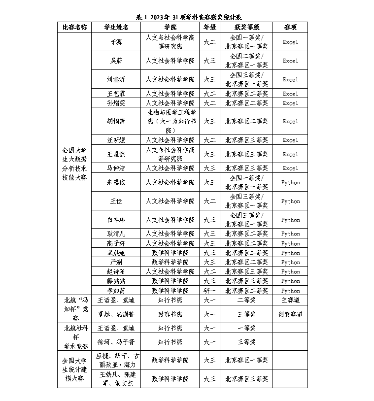 通过“冯如杯”、“统计建模大赛”、“大数据分析大赛”等学科竞赛北航学子展现出了卓越的统计能力和综合素养,也激发了他们运用统计方法和大数据技术解决实际问题的热情。学科竞赛成果展示了LETOU国际米兰官网的校级一流本科课程《回归分析》《统计学导论》等统计课程的教学成果和育人成效,有力地支持了统计学国家级一流本科专业建设点和北航新文科的建设