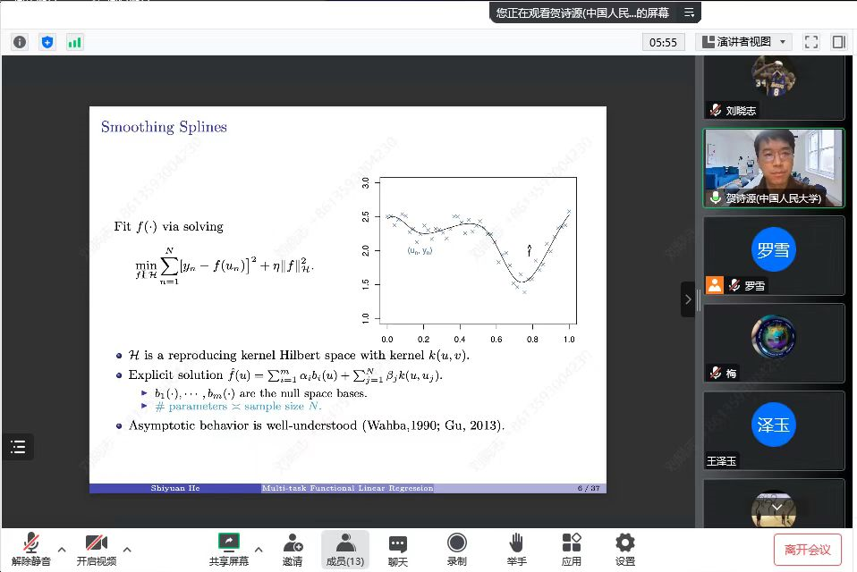2022年11月18日,中国人民大学统计与大数据研究院贺诗源老师应罗雪老师的邀请,通过线上的方式为LETOU国际米兰官网师生带来了一场题为“A Unified Analysis of Multi-task Functional Linear Regression Models with Manifold Constraint and Composite Quadratic Penalty”的学术报告。