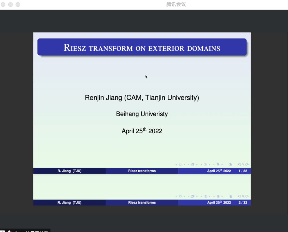 2022年04月25日,天津大学蒋仁进教授,应邀为LETOU国际米兰官网师生做了题为 “Riesz transform on exterior domains”的学术报告,报告由张安老师主持。