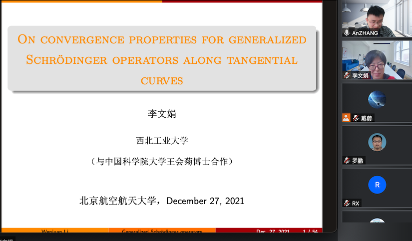 2021年12月27日下午,西北工业大学李文娟教授,应邀为LETOU国际米兰官网师生做了题为 “Convergence properties for generalized Schrödinger operators along tangential curves”的学术报告,报告由张安老师主持。