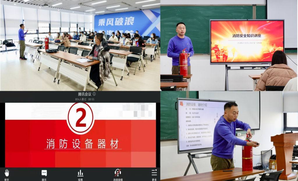 下午2:30,沙河校区管委会安保部负责人董祺瑞在现场和线上同时为全院师生系统讲解了消防安全基本知识、消防设备器材操作以及火场常用逃生方法。董老师从近几年发生在社会、高校的触目惊心的火灾案例出发,介绍了不同情况下不同的灭火和逃生方式及常见的消防设备,并现场讲解了干粉灭火器的使用方法。