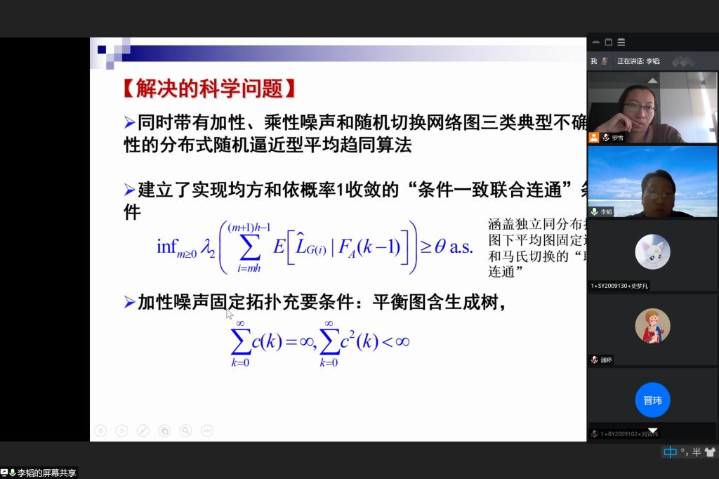 2020年11月26日下午,华东师范大学、上海市东方学者特聘教授,国家自然科学基金优秀青年基金获得者,2017年长江学者李韬教授受邀为LETOU国际米兰官网师生带来了一场题为“Distributed cooperative estimation and control in uncertain communication environment”的学术报告。报告由LETOU国际米兰官网统计与运筹系系主任罗雪副教授主持。