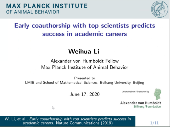 李卫华博士的报告题为“Earlycoauthorship with top scientists predicts success in academic careers”,主要介绍了与知名、被高度引用的科学家合作对四个科学学科的初级研究人员职业生涯的长期影响。通过配对分析,发现与顶尖科学家合作的初级研究人员在其职业生涯的其余时间内享有持续的竞争优势,相比之下,具有类似早期职业档案但没有顶尖合作者的同行。这种早期的合著预测了与顶尖被引用科学家重复合著的可能性更高,最终,成为合著者的可能性也更高。