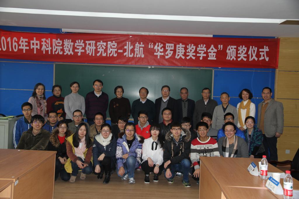 出席此次颁奖仪式的还有中科院研究生部的邵欣老师和刘霞老师,北航数学学院教学副院长杨义川教授、学院教师高宗升教授、漆毅教授和李红裔教授,北航数学学院机教师、辅导员,以及获奖的20名华班同学。自2015年起,中科院数学院与北航联合设立“华罗庚奖学金”,每年从华罗庚班评选出20名优秀学子,每人发放2000元奖金,本次获奖学生的名单如下:赵青,李冠巡,万艺君,王志超,冯亦葳,白瑞祺,杨睿劼,秦国林,苏啸宇,胡杰,沙铜,胡一飞,史庆祥,赵世帆,周郑晔,马骏宇,陈旭阳,陈昱蓉,方泓懿,孙禄 。