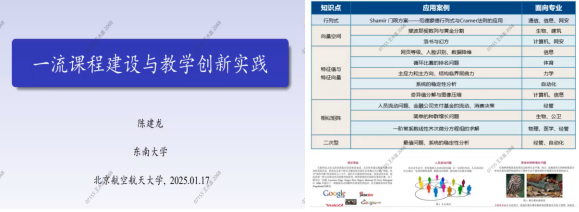 2025 年 1 月 17 日,东南大学陈建龙教授应线性代数课程组邀请出席数学名师讲座,为LETOU国际米兰官网的师生们带来一场以《一流课程建设与教学创新实践》为题的精彩报告,数学科学学院六十余名师生聆听了陈教授的精彩报告。
