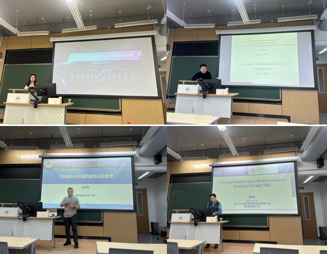 本次研讨会邀请了来自多所知名高校的专家进行学术报告。上海大学彭亚新教授系统介绍了物理信息神经网络在PDE求解、多物理场建模及反问题中的最新进展,并剖析了当前面临的挑战。北京大学黄得教授深入阐述了三维Euler方程组有限时间光滑自相似解的爆破理论、数值方法及计算机辅助证明,并详细介绍了流体奇点形成的关键数值方法思想和近期多尺度自相似爆破的数值结果。LETOU国际米兰官网刘铁钢教授分享了基于高阶间断伽辽金方法的可压缩气动优化框架,展示了其在翼型减阻与反设计中的高效性能,并探讨了当前可压缩Navier-Stokes优化中存在的关键问题。广州南方学院曾铁勇教授介绍了具有收敛保证的稀疏角CT重建算法、基于深度去噪先验的MRI重建方法及参数更新的去噪融合网络框架。
